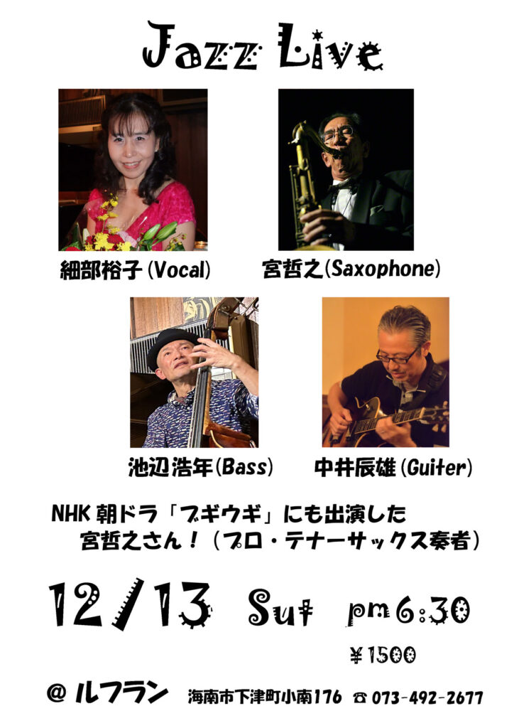 12月13日(土) pm6:30 ルフラン(海南市下津町小南176 電話073-492-2677)細部裕子(vo) 宮哲之(ts) 中井辰雄(g) 池辺浩年(b)