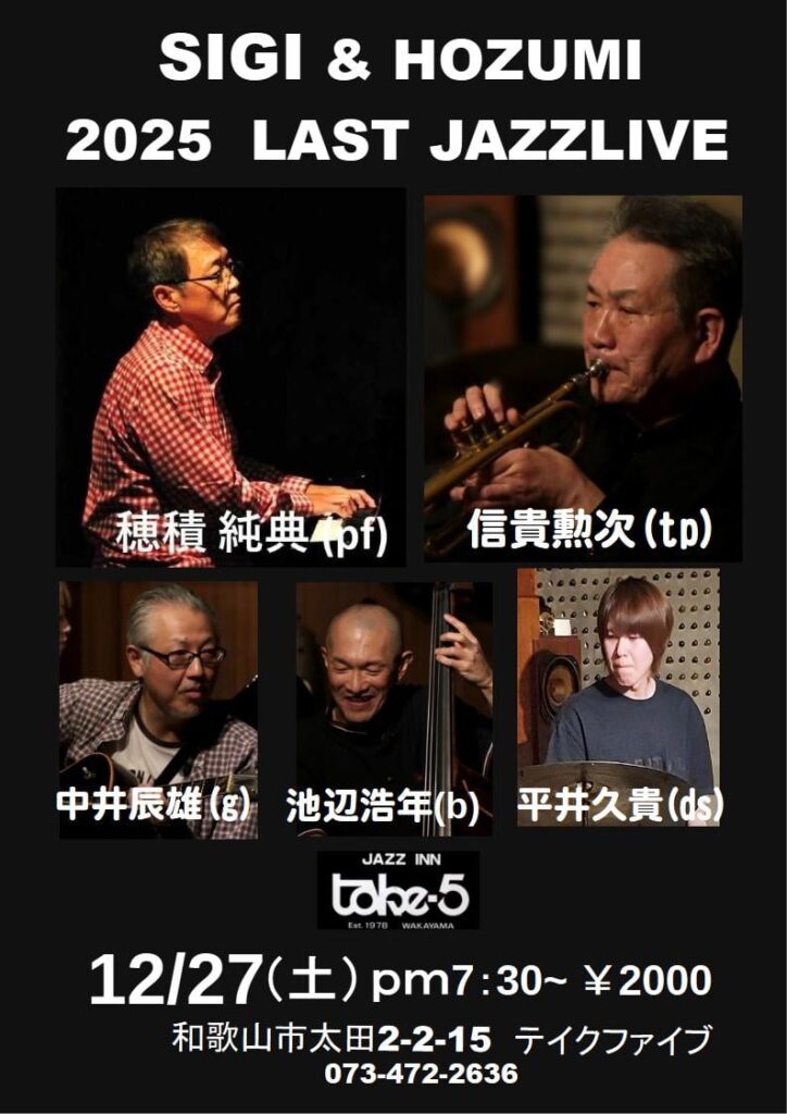 12月27日(土) pm7:30 Take-5信貴勲次(tp) 穂積純典(p) 中井辰雄(g) 池辺浩年(b) 平井久貴(ds)