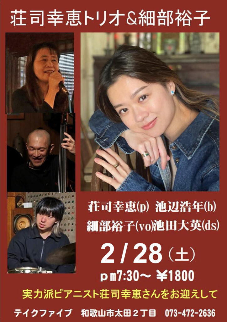 2月28日(土) pm7:30 Take-5荘司幸恵(p) 池辺浩年(b) 池田大英(ds) 細部裕子(vo)