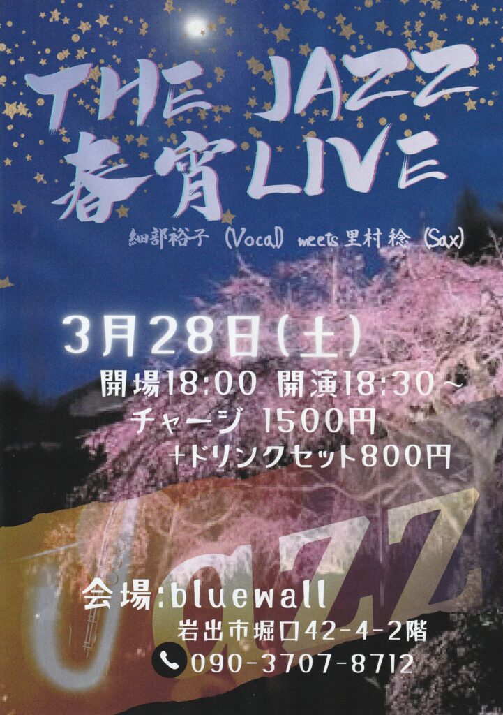 3月28日(土) pm6:30 bluewall(和歌山県岩出市42-4)細部裕子(vo) 荘司幸恵(p) 池辺浩年(b) 平井久貴(ds)